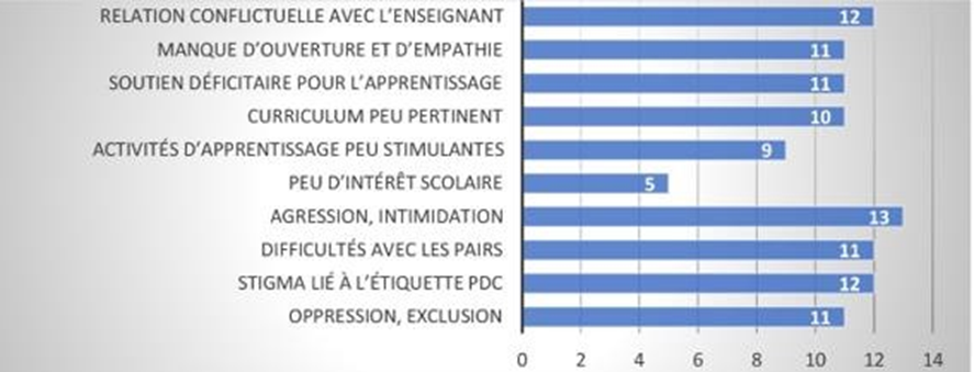 Inventaire des conditions qui entravent la scolarisation en classe ordinaire selon les élèves PDC et nombre d’articles qui en font mention